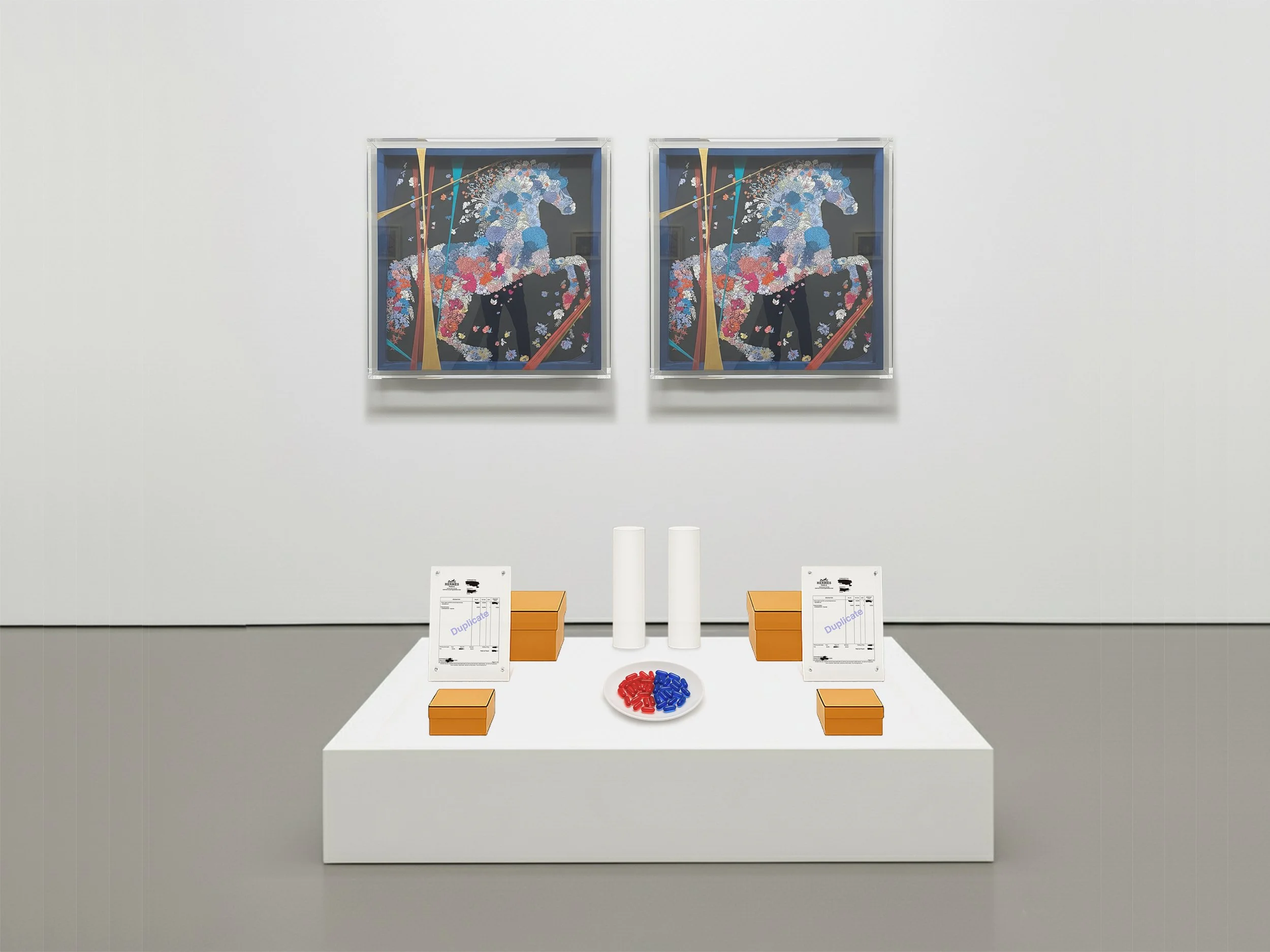Hermès silk scarves presented in acrylic cases, obscured by geometric fabric interventions. The democratic ritual of voting confronts the boundaries of perception and the construction of value through belief.